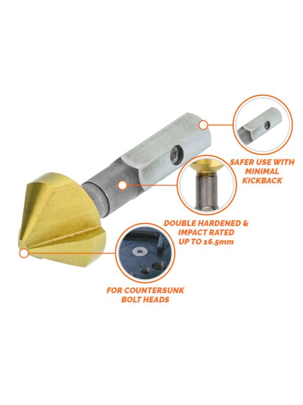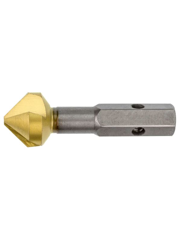 The VersaDrive Countersink is a premium quality countersink with fully ground flutes and GoldMax Titanium coating to help reduce wear and blunting.